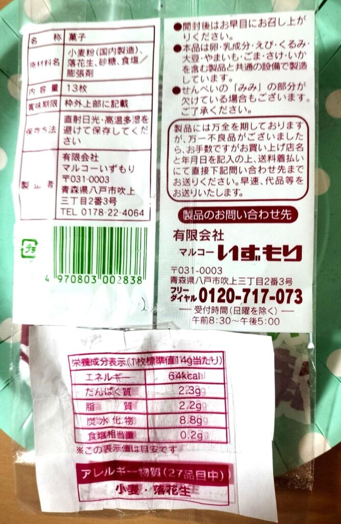 いずもりの南部せんべい(まめ)の商品情報|1個あたりのカロリーや値段・賞味期限・原材料まとめ