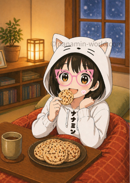 ナナミン:南部せんべい(まめ)って、ちょっとお腹が空いたときにちょうどいいおやつなんだよね〜🍪