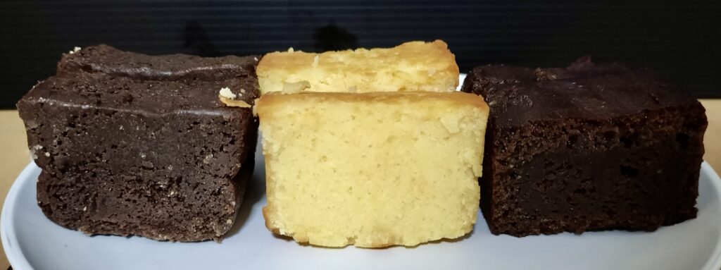 | 見た目(断面含む) | しっとり濃厚なチョコ生地✖️ぎゅっと詰まった密度感🍫 | 明るくミルキーなホワイトチョコ生地。少し自然な黄色みがある🥛 | チョコ生地の中にブルーベリーを混ぜ、断面に果実の色がちらりと見える🍇 |