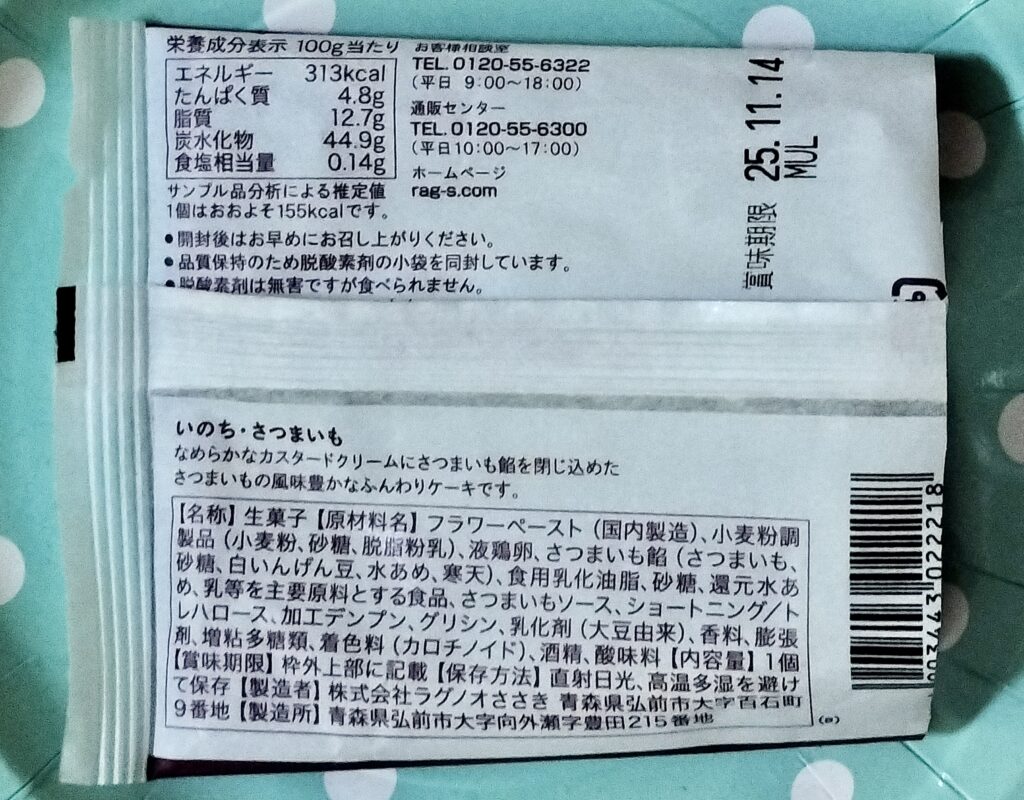 5. ラグノオの『いのち(さつまいも)』のカロリーは❓1個あたりのカロリーや賞味期限・原材料まとめ