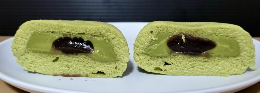 中央には抹茶クリームとその中にあんこが入っています。二層のコントラストが美しいです。