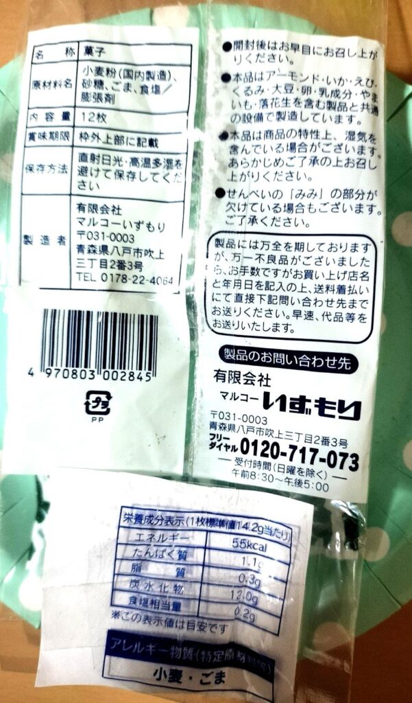 いずもりの南部せんべい(ゴマヌリ)の商品情報|I個あたりの値段・カロリー・賞味期限・原材料まとめ