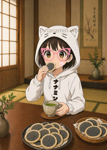 ナナミン:南部せんべい(ゴマヌリ)って、見た目はシンプルで落ち着いてる雰囲気だけど、食べてみると「あれ⁉️思ったよりも甘いかも😳」ってなるの〜✨🍘