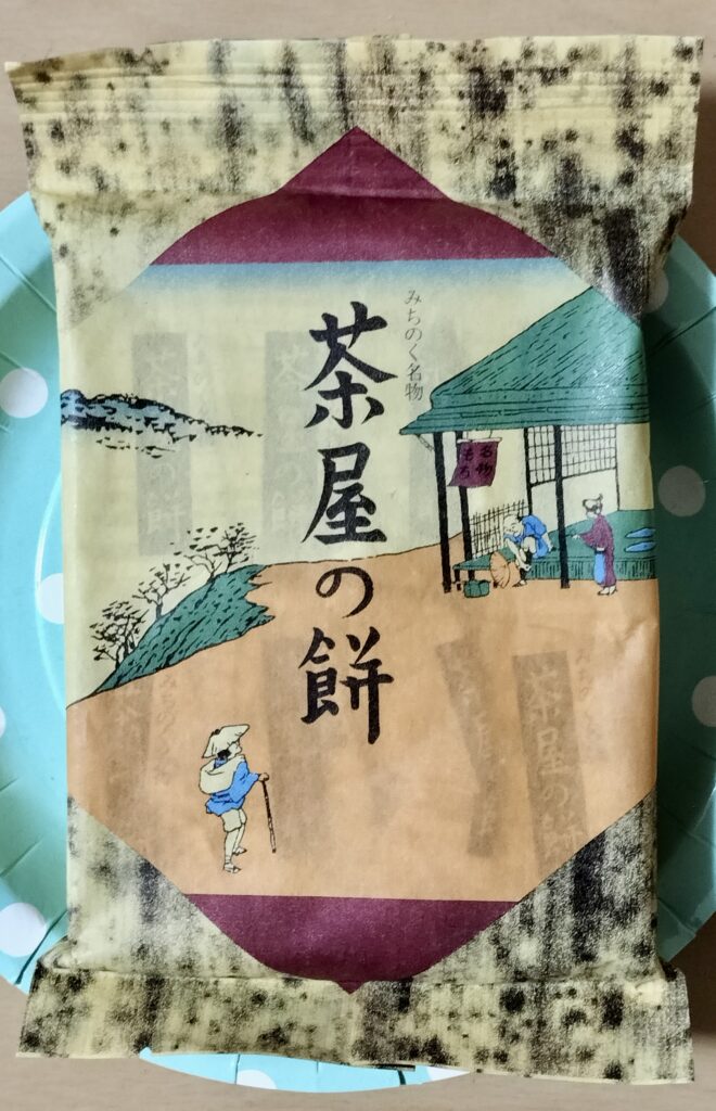 茶屋の餅の外袋は、茶屋が描かれた懐かしさを感じさせる和風デザインで、個包装は淡い色の和紙で落ち着いた雰囲気です。